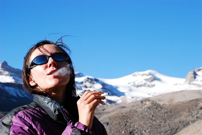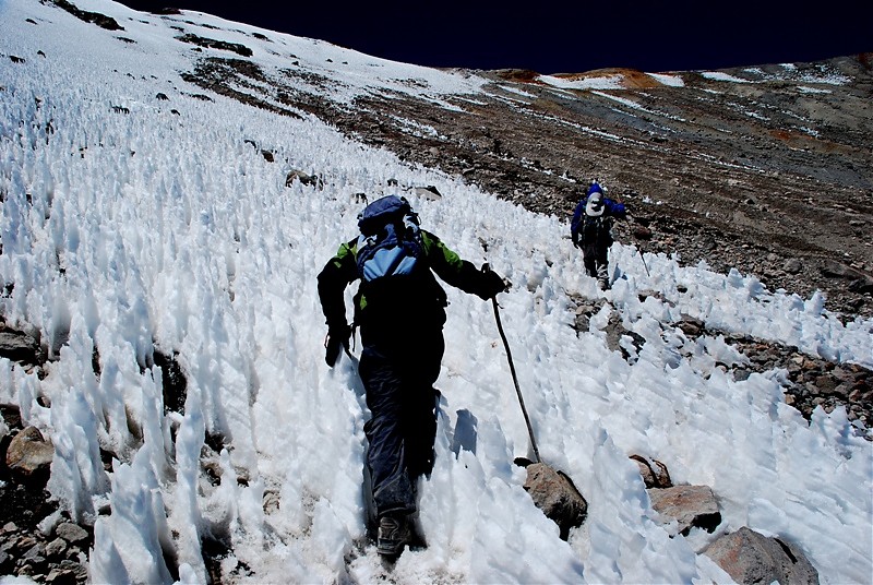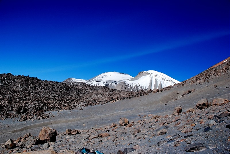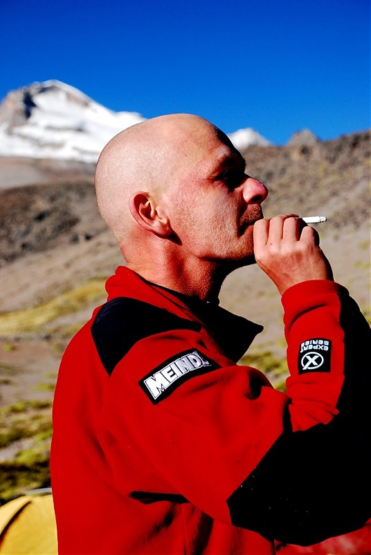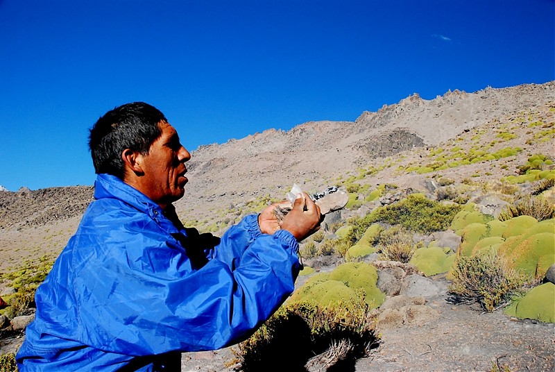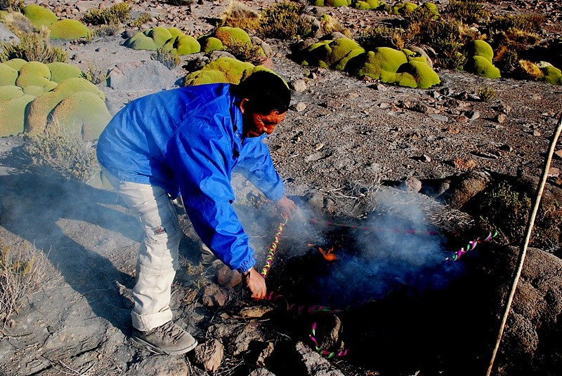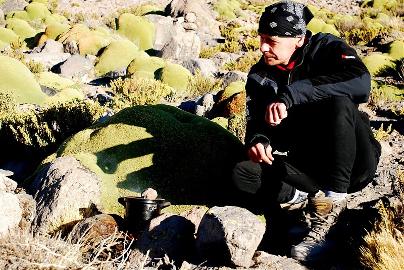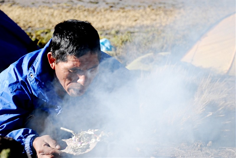 Kiedy rano słońce zaczyna ogrzewać namiot decyduję się na to, żeby z niego wyjść. Największą zmorą chodzenia po wulkanach zanim dotrze się do lodowca jest pył. Jest wszędzie. Czuję go nawet między zębami i mam wrażenie, że z każdą chwilą moje ubrania ważą więcej i więcej. Skromne śniadanie (chyba powinnam zaakceptować fakt, że podczas tej wyprawy raczej będę głodna ;)) i ruszamy. Wspinamy się na przełęcz i dalej schodzimy w dół. Remi nie jadł śniadania ale żuje kokę i co chwile częstuje nas a to liśćmi koki a to alkoholem o dziwnej nazwie jampi. Wygląda paskudnie ale nie odmawiam. Na wszelki wypadek nie pytam z czego jest zrobiony. Liczę, że wysokoprocentowy alkohol gwarantuje bezpieczeństwo trunku. Koka początkowo trochę szczypie w język ale z czasem znieczula na tyle, że nie czuję nie tylko mrowienia ale też zmęczenia. Szczęśliwie nie czuję też głodu ;). Po zaledwie 4 godzinach docieramy do kolejnego obozu Huatac na wysokości 4900 mnpm. Wody nie jest wiele ale jak widzę co wyczynia Remi to spodziewam się, że będzie ją wyciskał z trawy. Chyba, że……..chyba że dziś oprócz skromnego jedzenia ograniczymy jeszcze ilość spożycia wody ;). Po drodze minęliśmy kilka miejsc w których była woda i wygodne miejsce na obóz. Jednak Remi z zasady chce rozbijać obozy tam gdzie zakładali je Inkowie. Wierzy, że tylko tam jest bezpiecznie i ciepło. To prawda, chciałam iść drogą Inków, ale nie deklarowałam gotowości do robienia wszystkiego tak jak oni. Gdyby tak było pewnie poszłabym w alpakowych sandałach. Liczę na solidniejsze jedzenie i już nie pozostawiam decyzji Remiemu. Sama wyjmuję niezbędne produkty na kolację. Remi nie jest zachwycony i chcąc mieć ostatnie zdanie ustala chociaż kolejność ich jedzenia. Jest mi ona zupełnie obojętna więc daje mu tę odrobinę satysfakcji. Jedną z rzeczy którą Remi wyrzucił przed wyjściem był gaz. Rozpalanie ogniska kojarzy mi się zatem z gotowaniem. Nie tym razem. Jest wczesne popołudnie a ognisko pali się już sporym płomieniem. Chcę gotować makaron jednak zanim zdążyłam otworzyć usta Remi wpycha mi do rąk kawałek tłuszczu z wikunii. Jarek dostaje ten sam specyfik i oboje formujmy kulki, do których wtykamy liście koki. Chcę uszanować przekonania Remiego choć niełatwo europejczykowi uczestniczyć w takim obrzędzie. Remi pełen zaangażowania układa na kamiennej platformie kokę, tłuszcz wikunii, papierosy, aromatyczne rośliny, kawałek złotej folii, sreberka i kilka rodzajów kukurydzy. Do tego dorzuca słodycze i kolorowe konfetti. Pochyla się na darami i wypowiada życzenia i prośby. Prosi o bezpieczne wejście na szczyt i powrót do domu, prosi o zdrowie dla swojej rodziny i długie życie dla swojej matki. Nam każe zrobić to samo. Wreszcie wyjmuje plastikową butelkę z jampi i kilka pierwszych łyków wylewa na ziemię zanim sam się go napije. Podaje mi butelkę i kiedy chcę wziąć pierwszy łyk jego głośny, pełen przerażenia wrzask przypomina mi o wylaniu kilku pierwszych kropel trunku na ziemię dla Pachamama. Wreszcie wszystko wrzuca do ogniska. Kiedy kukurydza pęka z trzaskiem biega dookoła ogniska wzruszony mówiąc „Gracias, gracias”. To podobno odpowiedź bogów gór i zgoda na wejście na szczyt.