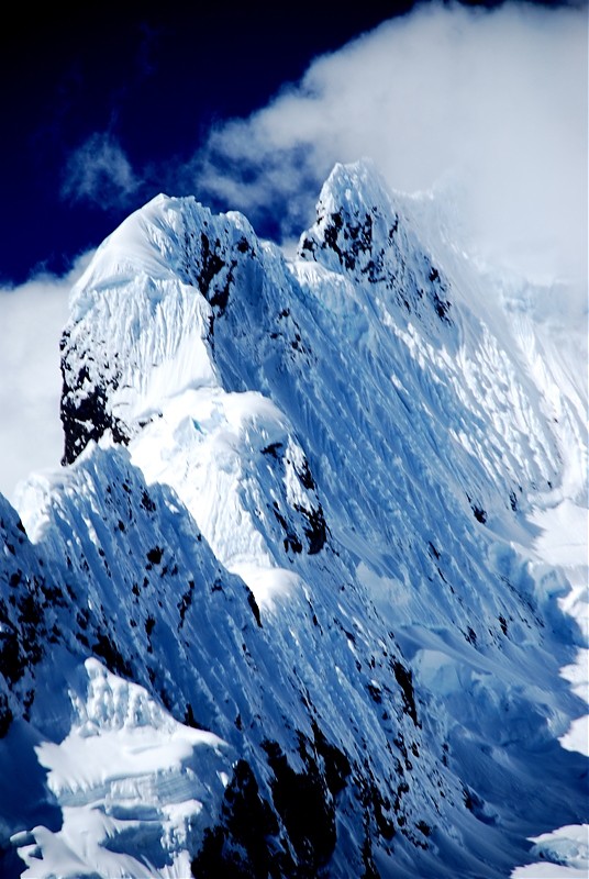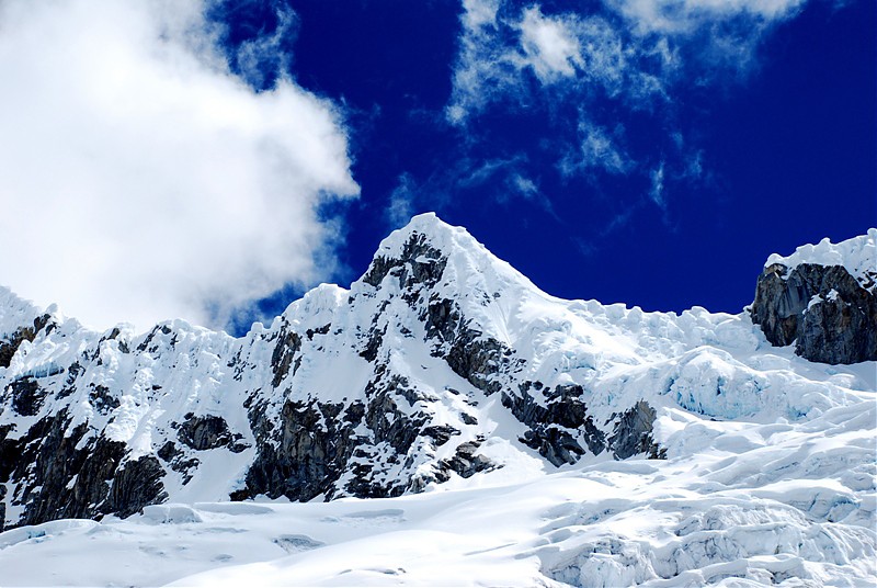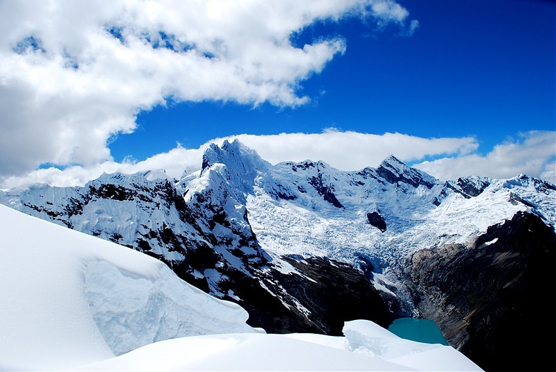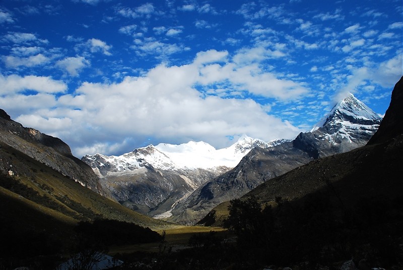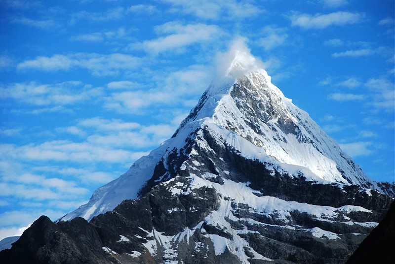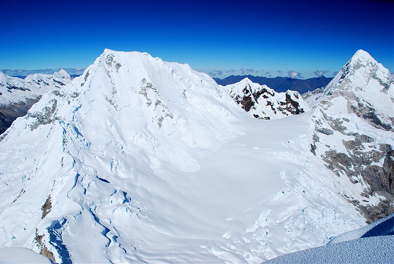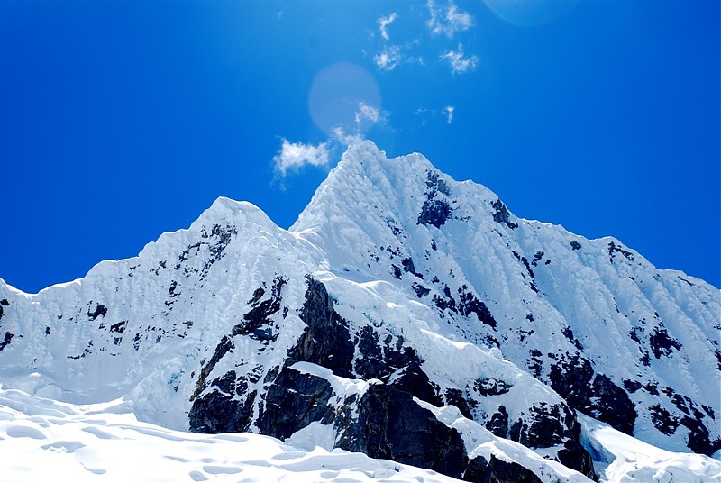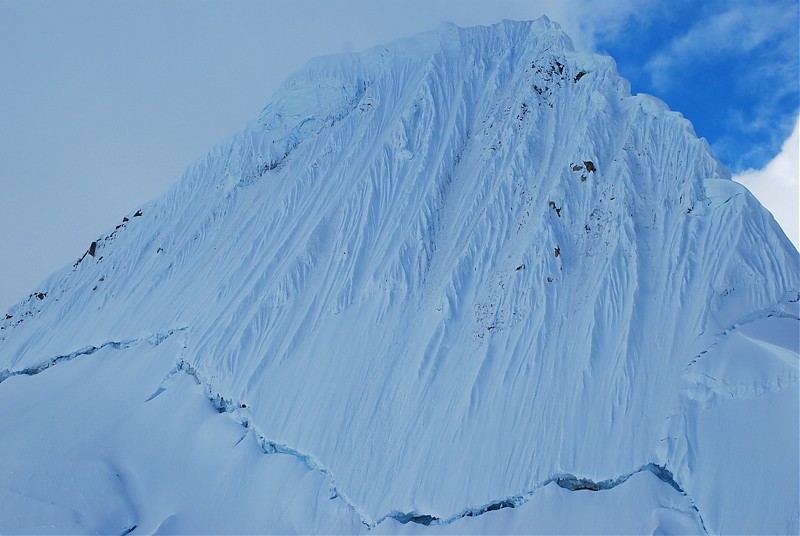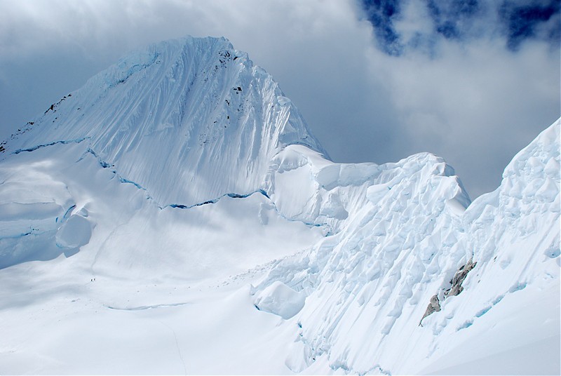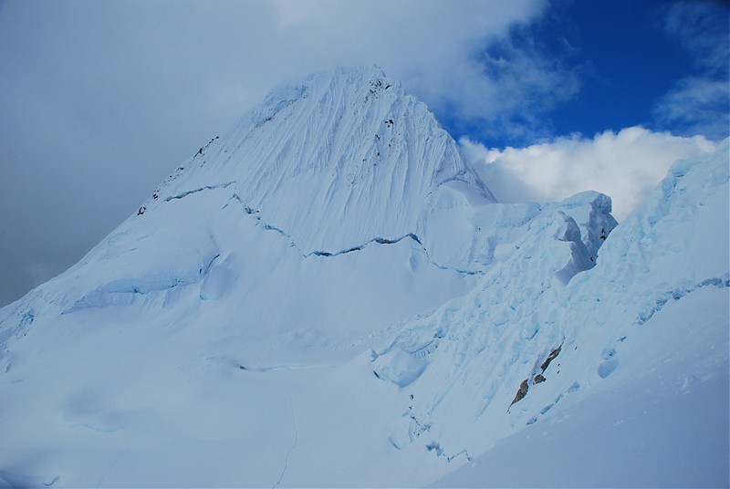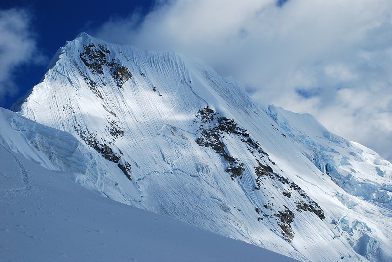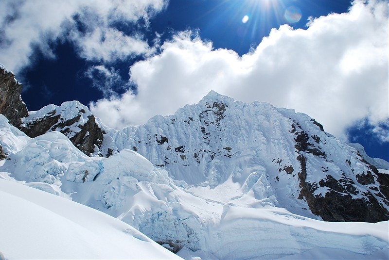 Na samym końcu doliny Santa Cruz w północno – wschodniej części Cordillera Blanca, w otoczeniu potężnych ścian Pucachirca i dostojnych grani Quitaraju stoi przepiękna lodowa katedra która nie bez przyczyny zyskała miano najpiękniejszej góry świata. Alpamayo nie było w naszych planach. Jest jednak tak piękna, że będąc tak blisko trudno o nią nie zawalczyć. Choć najpiękniej prezentuje się od północnej strony, południowo-zachodnia ściana jest najbardziej popularna i gromadzi najwięcej wspinaczy z całego świata.