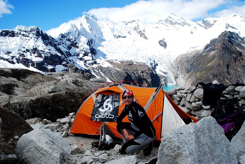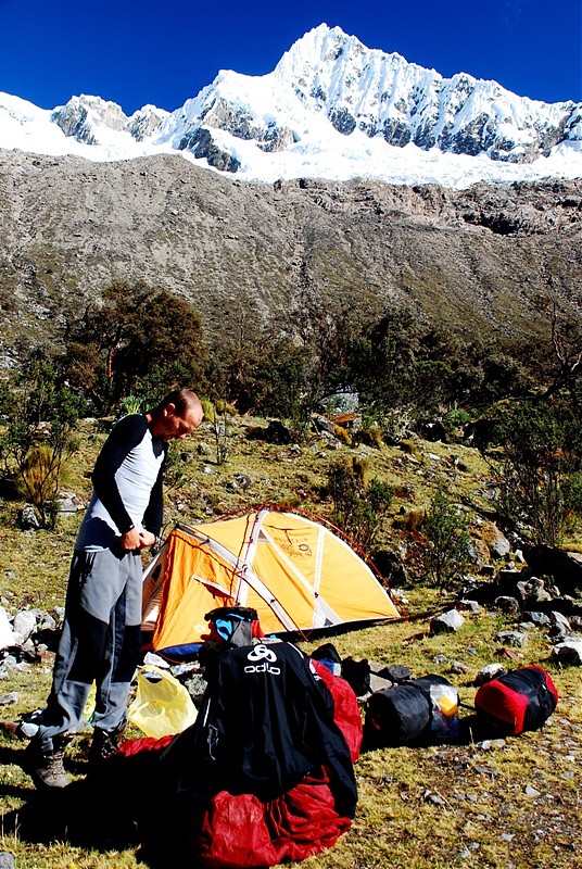 Pierwszego dnia dojeżdżamy do Cashapampy i tam wynajmujemy muły. Ruszamy bardzo spokojnie do góry. Pierwszy odcinek drogi jest dość stromy ale szybko docieramy do przepięknej doliny Santa Cruz. Dalej wzdłuż rzeki idziemy po w miarę płaskim terenie aż docieramy do pierwszego obozu Llamacoral na wysokości 3700 mnpm. Jest słonecznie choć chłodno. Szybko rozbijamy namioty, gotujemy jedzenie i cieszymy się ciszą i pustką bo to rzadkie szczęście pod Alpamayo. Oprócz naszej ekipy nie ma na razie nikogo, przynajmniej tu w Llamacoral. Kolejnego dnia budzimy się leniwie. Do bazy zaledwie 4 godziny drogi więc nie ma powodu aby się spieszyć. Śniadanie, kawa i …..drugie śniadanie w czasie kiedy suszymy namioty i śpiwory. Zwykle rano jest słońce więc wykorzystujemy najmniejszy jego promyk aby się ogrzać i wysuszyć. Wreszcie ruszamy i w 3 godziny docieramy do bazy. Tam jest już spory tłok. Kilka teamów aklimatyzuje się w bazie od kilku dni a my w towarzyskiej atmosferze znajdujemy chwile na to aby uciec od zgiełku i nacieszyć oczy przepięknym widokiem Artesonraju. Jest tak piękny, że z pewnością gdyby nie sąsiedztwo Alpamayo mógłby ubiegać się o miano najpiękniejszej góry świata. Kolejnego dnia w planach mamy dotarcie do Campo Alto na lodowcu u stóp Alpamayo na wysokości 5500 mnpm ale po drodze dopada mnie tak koszmarny ból głowy ze decydujemy się na to aby przenocować nieco niżej w Campo Morena na wysokości około 4900 mnpm. Ból głowy nie puszcza mimo ibupromu a noc jest już bardzo zimna. Rano na morenie jest zbyt zimno aby utrzymać to leniwe dotychczas tempo. Szybkie śniadanie, pakowanie i w drogę. Lodowiec jest zaledwie 10 minut od obozu. Wreszcie trochę lżej bo zakładamy na siebie sprzęt zamiast nosić go w plecakach.