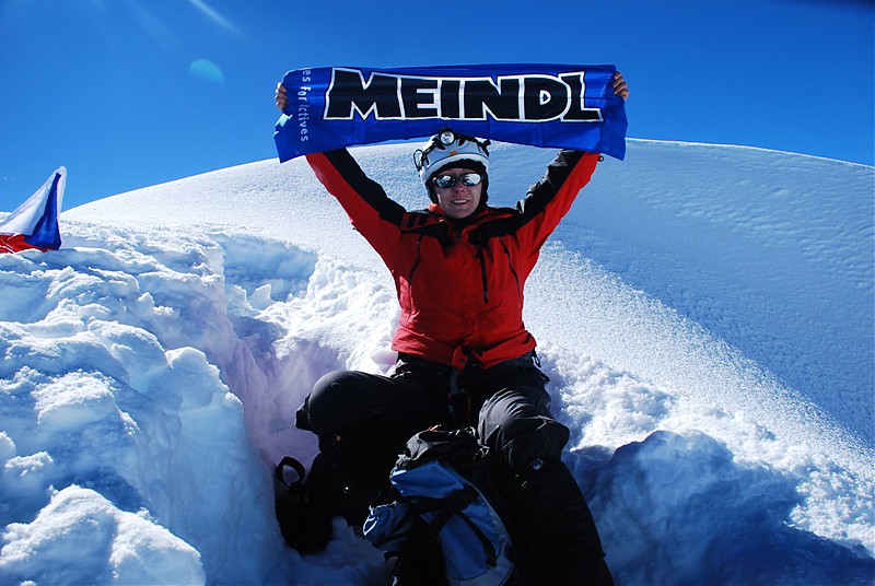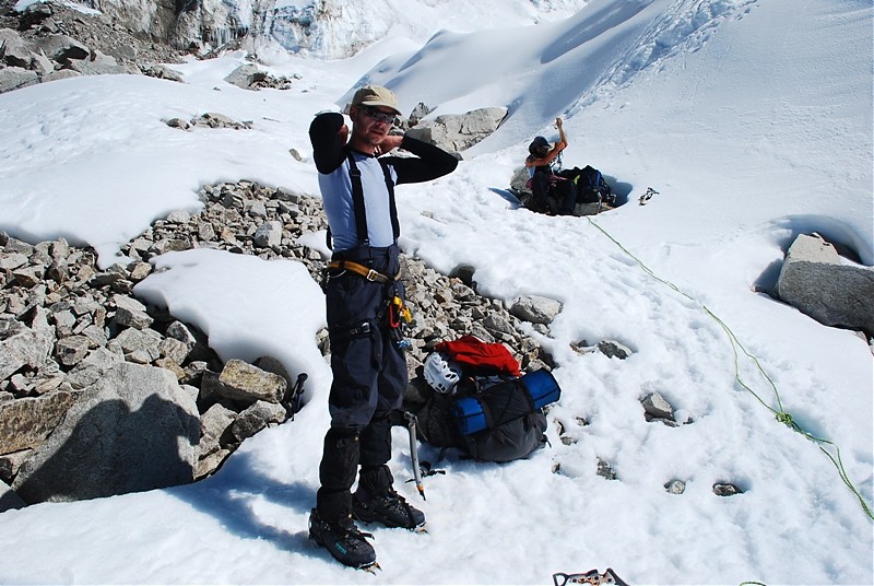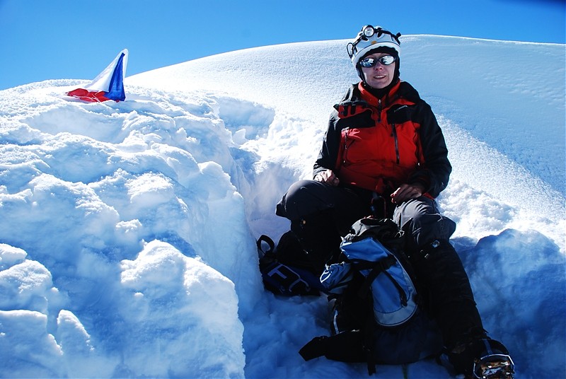 Zapada decyzja, ze przynajmniej podejmiemy próbę wejścia na szczyt. Jak warunki nadal będą tak fatalne wrócimy. Światełka w innych namiotach sugerują, że nie jesteśmy osamotnieni w tej decyzji. Ruszamy około 3 rano. Nie jesteśmy sami. Oprócz nas wspina się jeszcze grupa 12 Tyrolczyków. Dopóki w ścianie jest śnieg jest znośnie. Ale ten kończy się szybko i wraz z rosnącym nachyleniem śnieg zamienia się w lód. Jak kilka razy dostaję bryłą lodu w kask zaczynam mieć obawy za każdym razem kiedy chce podnieść głowę do góry. Lód sypie się na głowę, kilka razy dostaje w rękę ale kiedy trafia mnie na tyle spory kawał lodu, że wypadam ze stanowiska żałuję, że nie jesteśmy w ścianie pierwsi. I tak 400 metrów. Wreszcie docieramy pod sam szczyt. Tam robi się korek. Na szczycie zmieszczą się 3-4 osoby a nas jest znacznie więcej w tym „ścianowym korku”. Marznę w oczekiwaniu na wolne miejsce. Wreszcie możemy wejść i wreszcie na szczycie pojawia się słońce. Mamy zaledwie kilka chwil. Kilka zdjęć, łyk herbaty i zjeżdżamy na dół. Jeden wyciąg, drugi…piaty….. Wreszcie docieramy do szczeliny u podnóża góry i dalej już łatwo dochodzimy do obozu. Tam znowu kilka łyków herbaty i pakujemy się. Udało się!!!!!! 10 czerwca 2009 stanęliśmy na szczycie najpiękniejszej góry świata!!!! Alpamayo zdobyte!!! Wracamy!!!