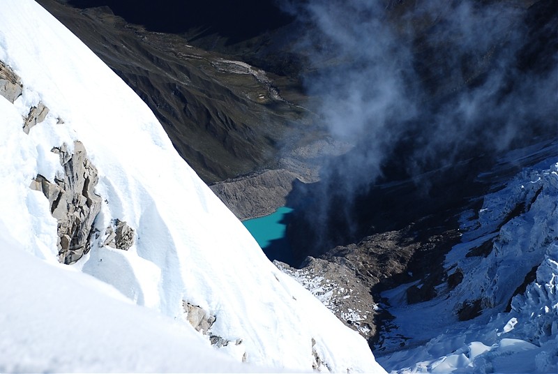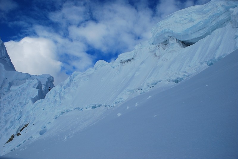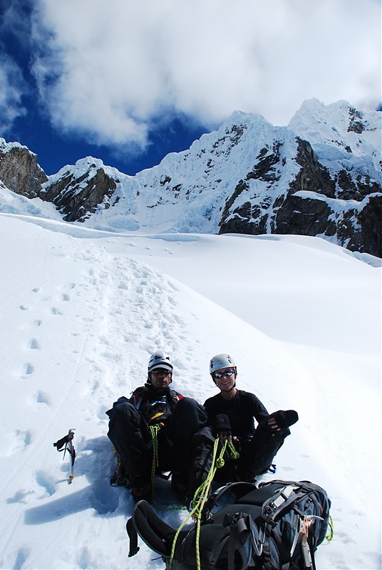 Szybko i bez większych utrudnień docieramy do przełęczy. Po drodze mijamy kilka małych szczelin i docieramy do nachylonej o 55 stopni ścianki pod przełęczą. Sporo śniegu, trochę potu i jesteśmy na przełęczy. Wreszcie naszym oczom ukazuje się północno-zachodnia ściana Alpamayo. Jest piękna!!!!! Lokalni Indianie w języku Quechua mówią o tej górze Kraina Rzek, bo koronkowe, lodowe „rynny” w ścianie Alpamayo przypominają rzeczne koryta.