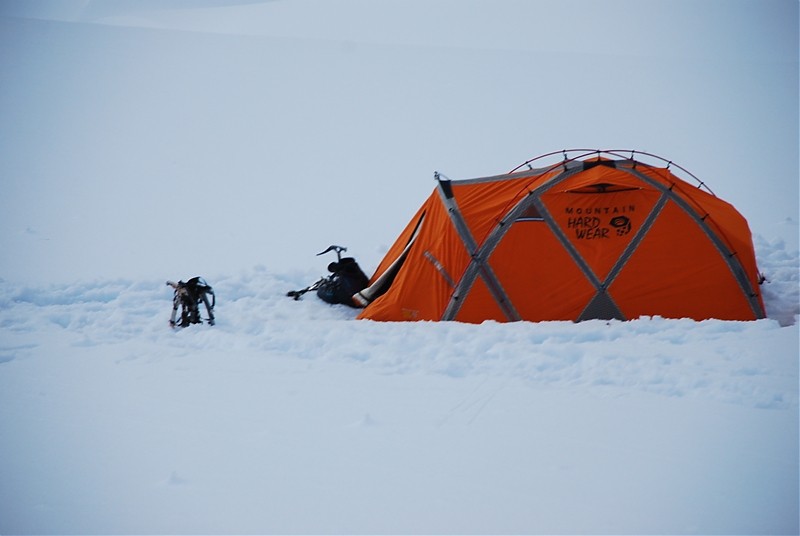 Rozbijamy namioty tak szybko jak to możliwe bo nad nami zbierają się coraz cięższe chmury. Zaczyna wiać coraz silniejszy wiatr ale pamiętam, że w czerwcu pogoda jest bardzo zmienna więc nie martwię się zbytnio tymi warunkami. Kiedy tylko słońce chowa się za chmurami robi się tak zimno, że natychmiast chowam się w swoim śpiworze. Rozgrzewam się gorąca herbatą i nie mogę się doczekać 1 rano aby wreszcie wyruszyć na szczyt. Nie mogę zasnąć. Nie wiem czy z powodu niecierpliwości czy z niepokoju który budzi silny wiatr, coraz mocniej szarpiący nasz namiot. Wreszcie budzik oznajmia że jest godzina 24 ale wtedy przychodzi Jose. W jego oczach widzę niepewność i zanim Jose zdążył cokolwiek powiedzieć wychylam się z namiotu. Mleko! Gęsta mgła która sprawia, że nie widać nawet sąsiednich namiotów. Do tego lodowaty, silny wiatr. Ustalamy że spotykamy się za godzinę ponownie i wtedy podejmiemy ostateczną decyzję co do tego czy ruszamy w górę czy rezygnujemy. Ta godzina mija szybciej niż mogłabym się spodziewać. Zanim Jose otwiera namiot wiem już, że pogoda się nieco poprawiła. Nadal jest mgła i sypie śnieg, ale na szczęście widać już sąsiednie namioty.