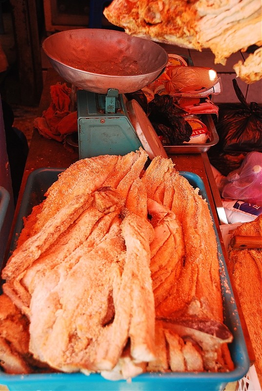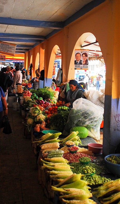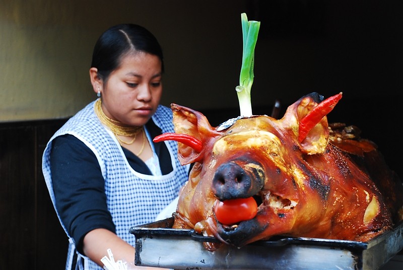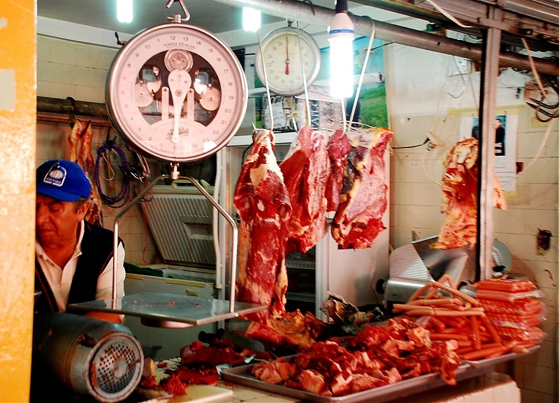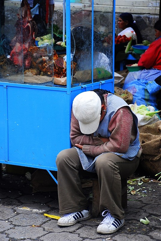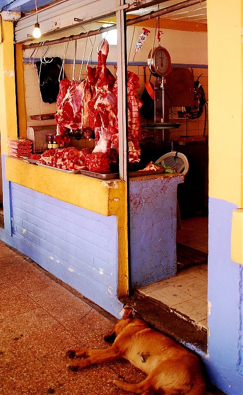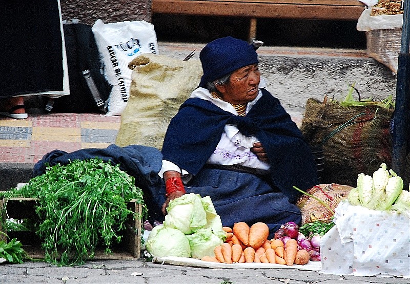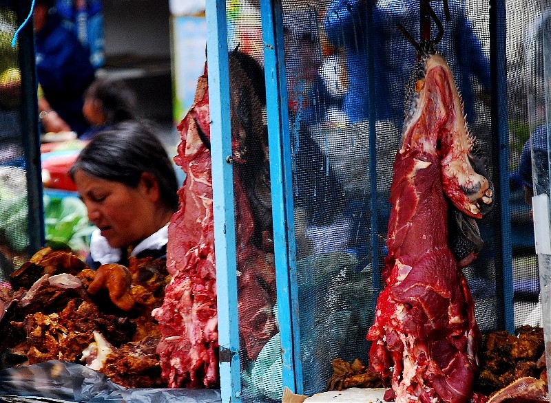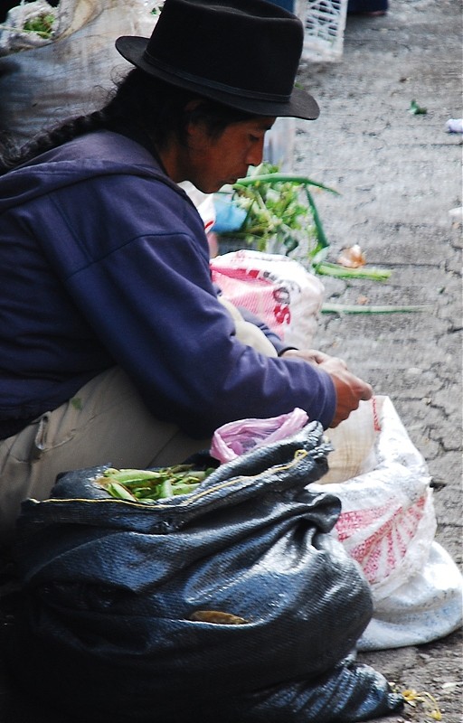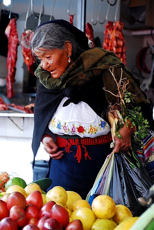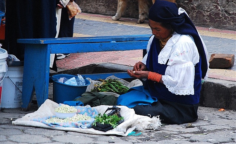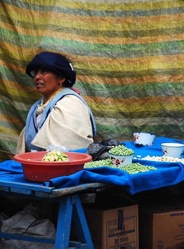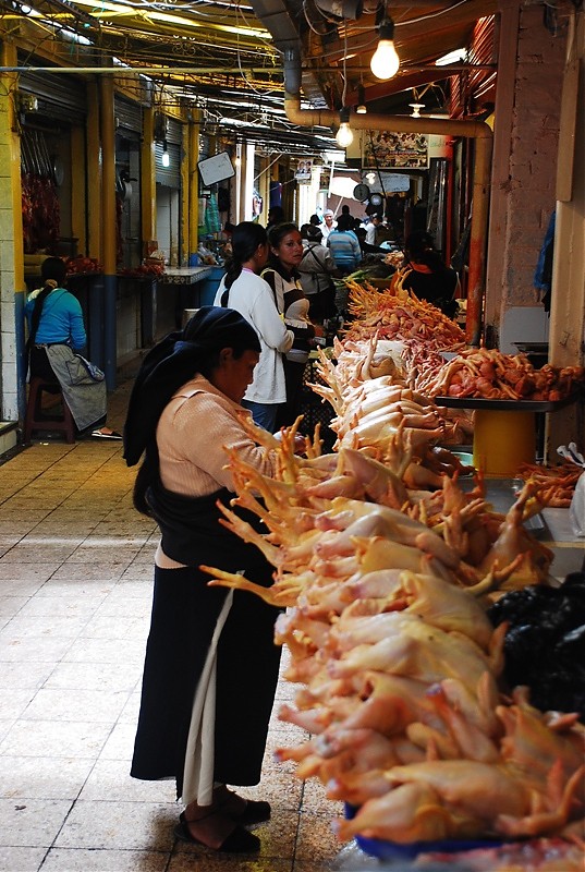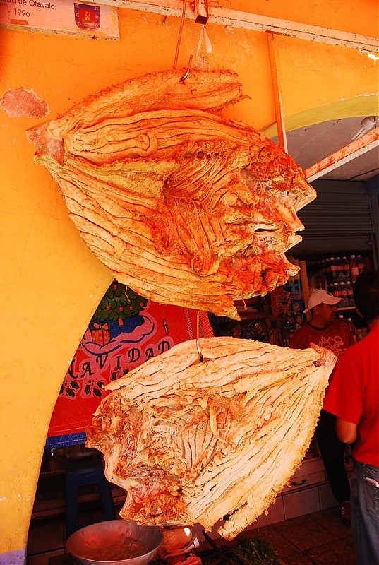 Tak na prawdę Otavalo ma dwa targi. Jeden pełen rzemiosła lodowego dla turystów i drugi warzywno-spożywczy dla tubylców. Dla mnie to najbardziej fascynujące miejsce w Otavalo. Nie spotkasz tam za wielu turystów bo sama musze przyznać ze widok „stoisk mięsnych” odstrasza. Spacer wśród stoisk mięsnych zaliczyć można do sportów ekstremalnych. To prawdziwy „spacer twardziela” i prawdopodobnie każdy kto się na niego zdecyduje na długo pozostanie wierny diecie wegetariańskiej. Jednak właśnie tu jest PRAWDZIWE ŻYCIE. Tu spotkasz tradycyjnie ubranych Indian w ich codziennych strojach a nie odświętnych, cepeliowych. Tu kupisz wszystkie rodzaje bananów w bardzo niskiej cenie, tu zobaczysz stare, surowo wyglądające kobiety które sprzedają zioła na wszelkie dolegliwości. Z ukrytym pod surowym spojrzeniem uśmiechem wyjaśnia Ci ich zastosowanie jeśli tylko będziesz ciekawy.